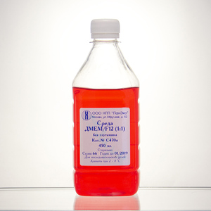 Представляет собой растворённую в очищенной воде смесь неорганических солей, аминокислот, витаминов, глюкозы и фенолового красного, простерилизованную методом мембранного фильтрования. Среда DMEM/F12 представляет собой смесь компонентов сред DMEM и F-12 в соотношении 1:1, при этом готовится не путём смешивания готовых сред, а из отдельных компонентов. Содержит бикарбонат натрия в качестве буфера, не содержит глутамина*.